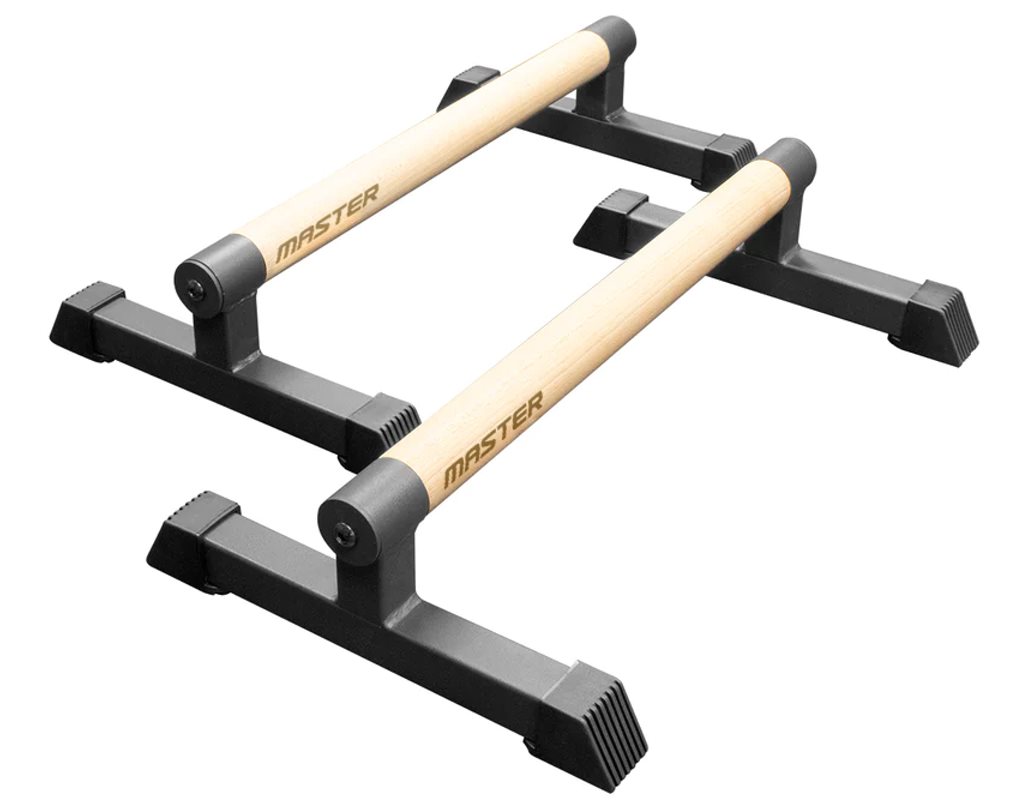 Parallettes för calisthenics och kroppsviktsträning. Perfekta för L-sits, armhävningar och handstående armhävningar (HSPU). Har en svart pulverlackerad stålbas, 38 mm trähandtag för ett säkert grepp samt gummifötter för stabilitet. Finns i tre storlekar: liten, medium och stor. Säljs i par.